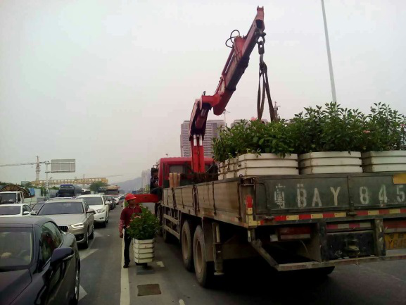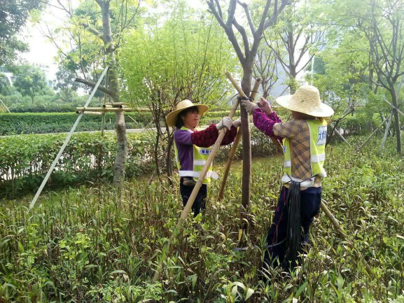(我司綠化管養(yǎng)中心對(duì)綠化苗木進(jìn)行加固)