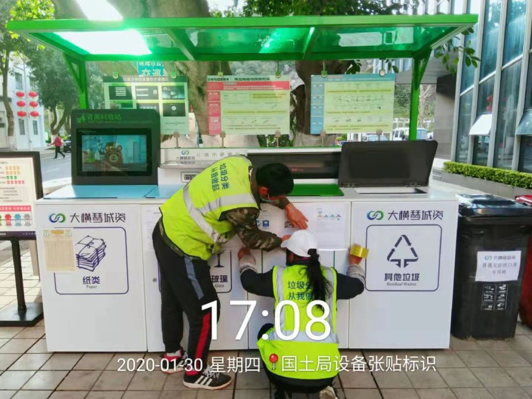 工作人員在垃圾分類設備上貼上指引流程