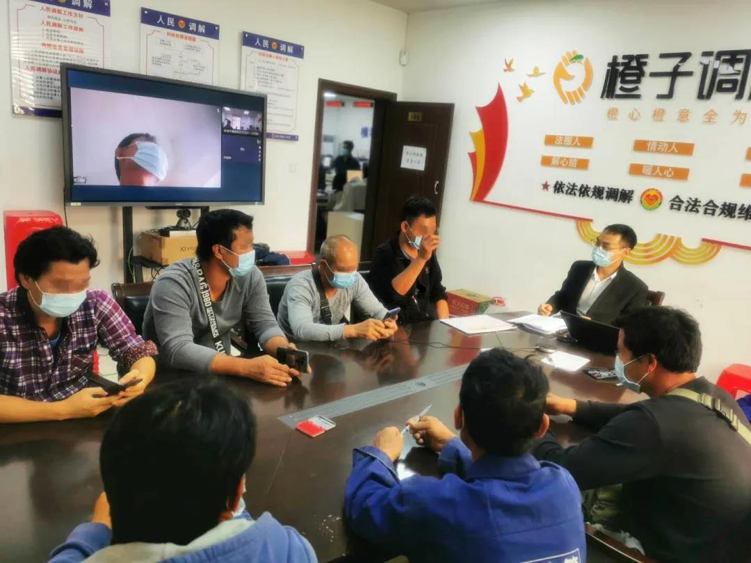 橙子調解工作室的調解員明政在仔細了解案件后,第一時間安撫工人,并電話連線包工頭何某。得知何某因疫情原因,不方便來到現場當面協商處理,為保障當事人的合法權益,調解員多次與各方當事人進行電話溝通,最終,約定通過遠程視頻進行調解。
