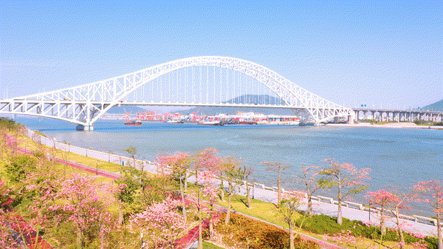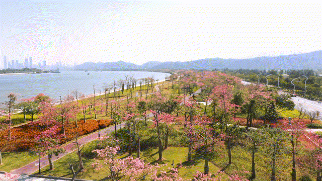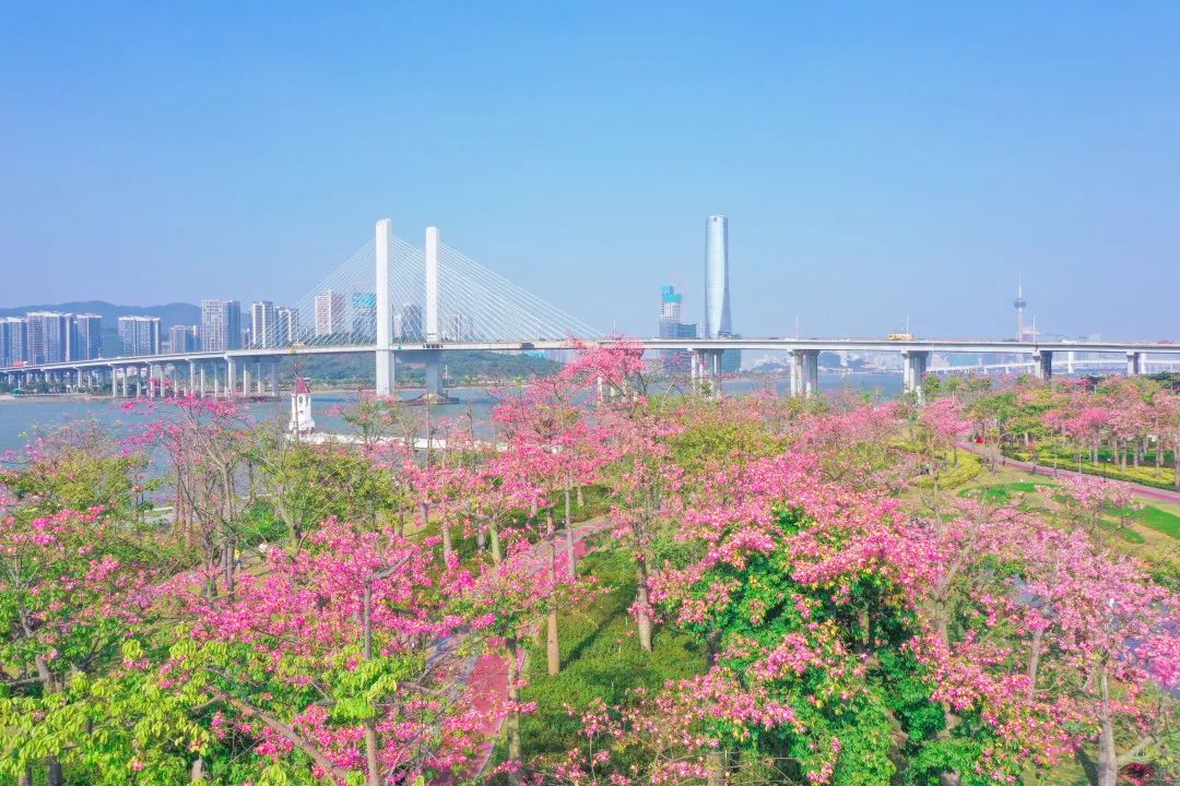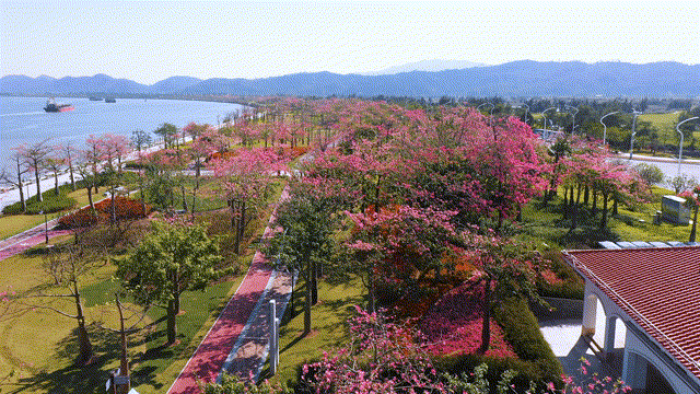 每年11月至12月,在橫琴花海長廊,進入花期的櫻花木棉以粉白、粉紫色的花朵開滿枝頭,整條濱海步道燦若云霞,美不勝收。