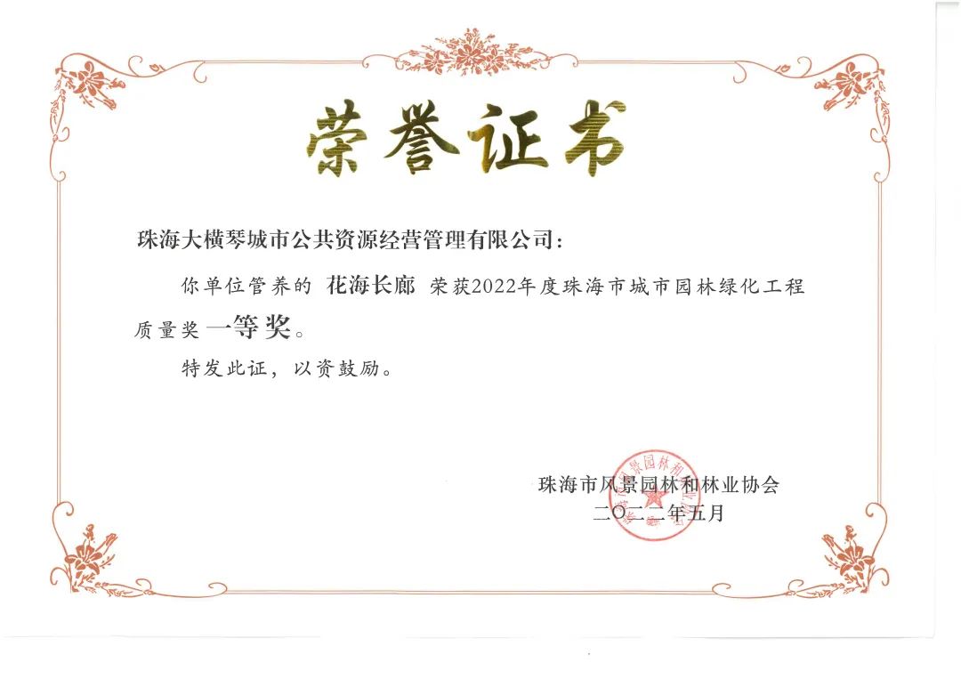 近日傳來喜訊,由大橫琴城資管養的橫琴花海長廊榮獲由珠海市風景園林和林業協會頒發的2022年度珠海市城市園林綠化工程質量獎一等獎。