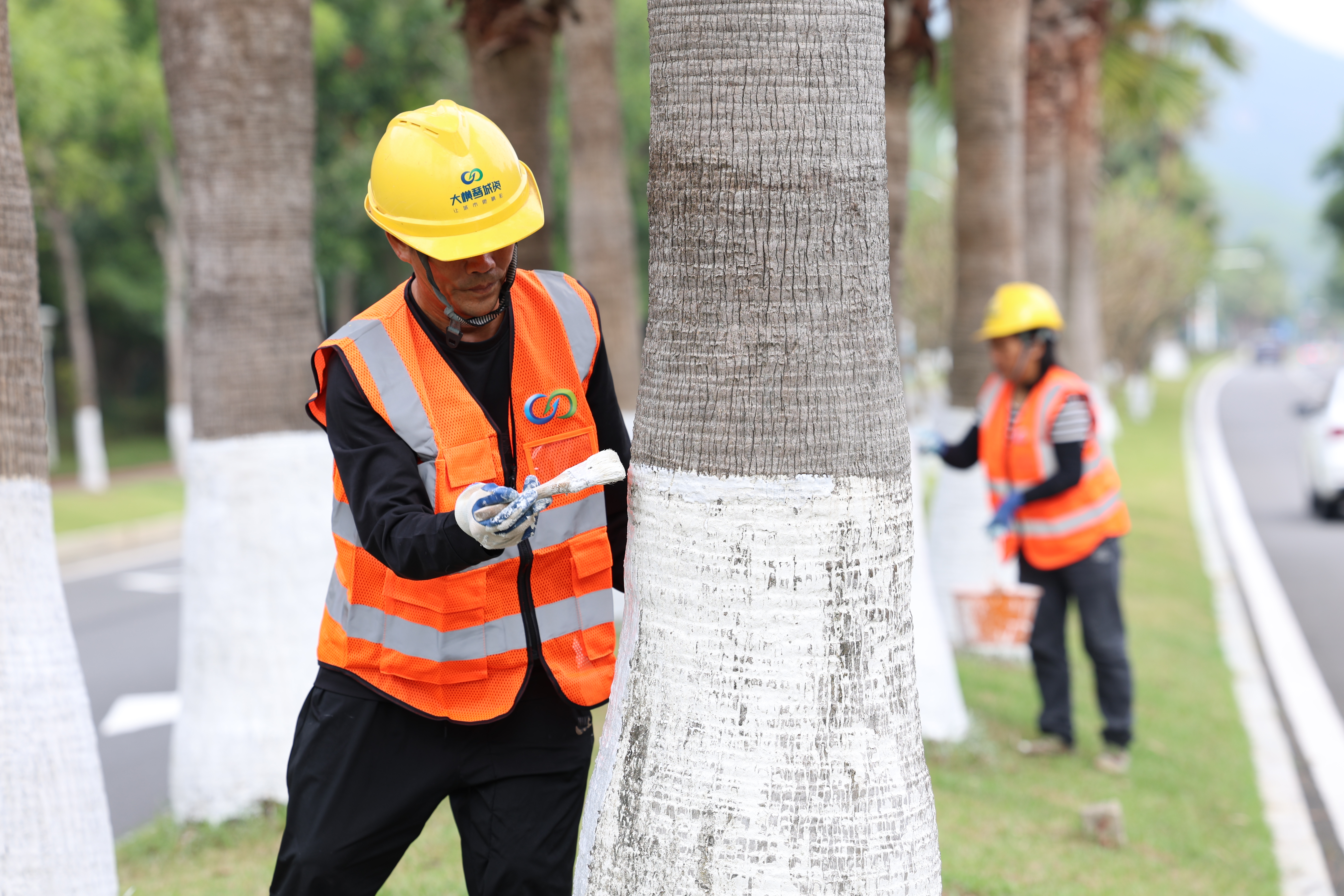 細致地為行道樹涂抹白色的涂料