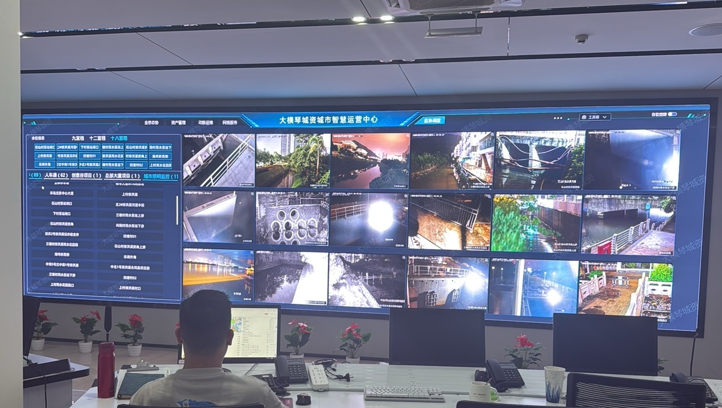 大橫琴城資城市智慧運營中心已上線對接水利、照明等各業務近兩百個全島視頻監控點,可實時獲取各水利設施、人車通水位信息和監控畫面,及時了解警戒水位和周邊現場情況,提高巡查效率。運營中心在三防期間實行24小時輪班制,輔助開展三防工作。